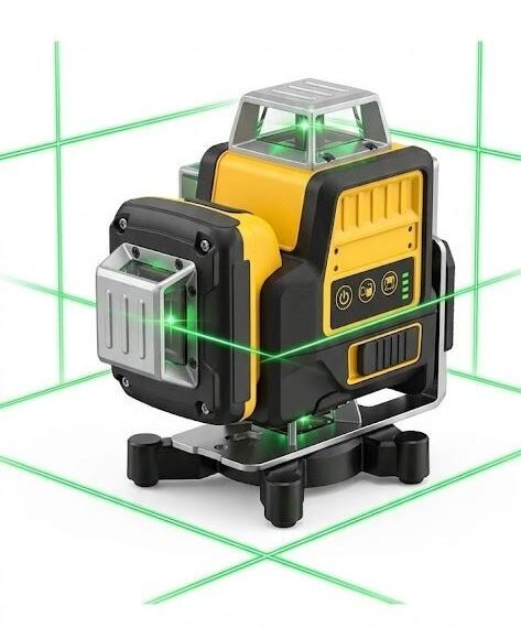 Professional-grade laser level with bright green beams for full-room coverage, designed for precise alignment, leveling, and layout work in construction and interior projects. Projects three 360° lines (1 horizontal, 2 vertical) for accurate measurements, with self-leveling function and strong visibility even in bright conditions. Comes with rechargeable 12V battery, charger, mounting bracket, and carry case for easy use on job sites.